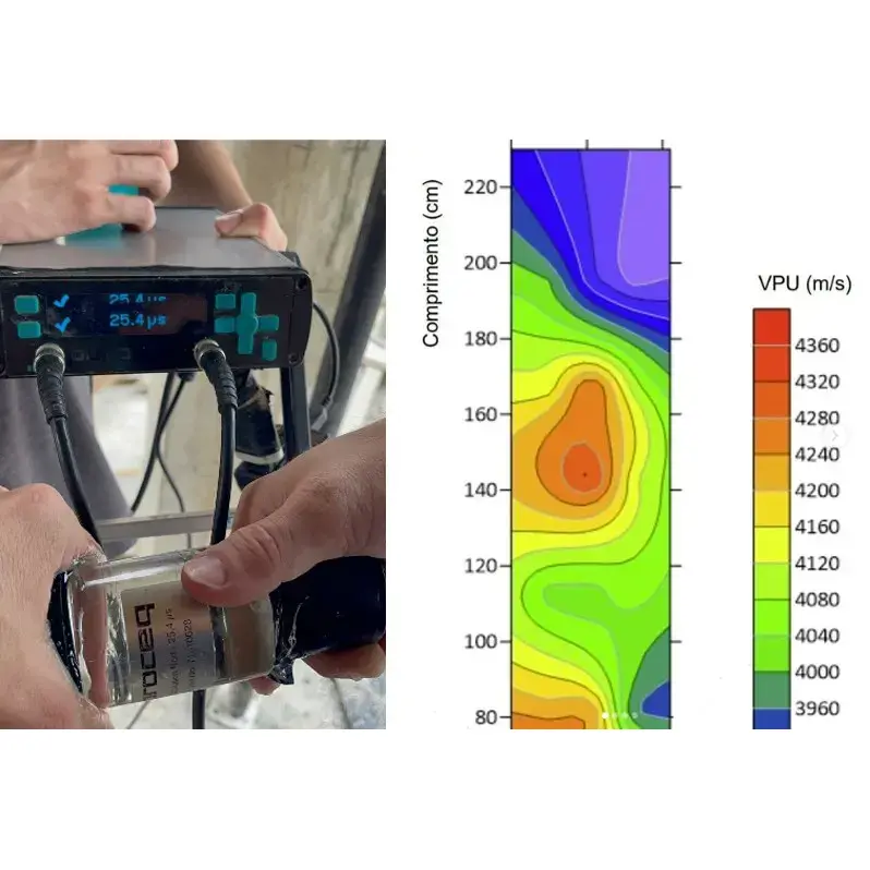 O ensaio de ultrassom é utilizado para verificar a integridade de estruturas, detectando irregularidades internas, monitorando a qualidade e/ou o desgaste dos materiais constituintes e estimando propriedades, como o módulo de elasticidade do concreto e das argamassas. Esse ensaio é realizado conforme as prescrições das normas da ABNT: NBR 8802:2019, NBR 13281-1:2023 e NBR 13281-2:2023.